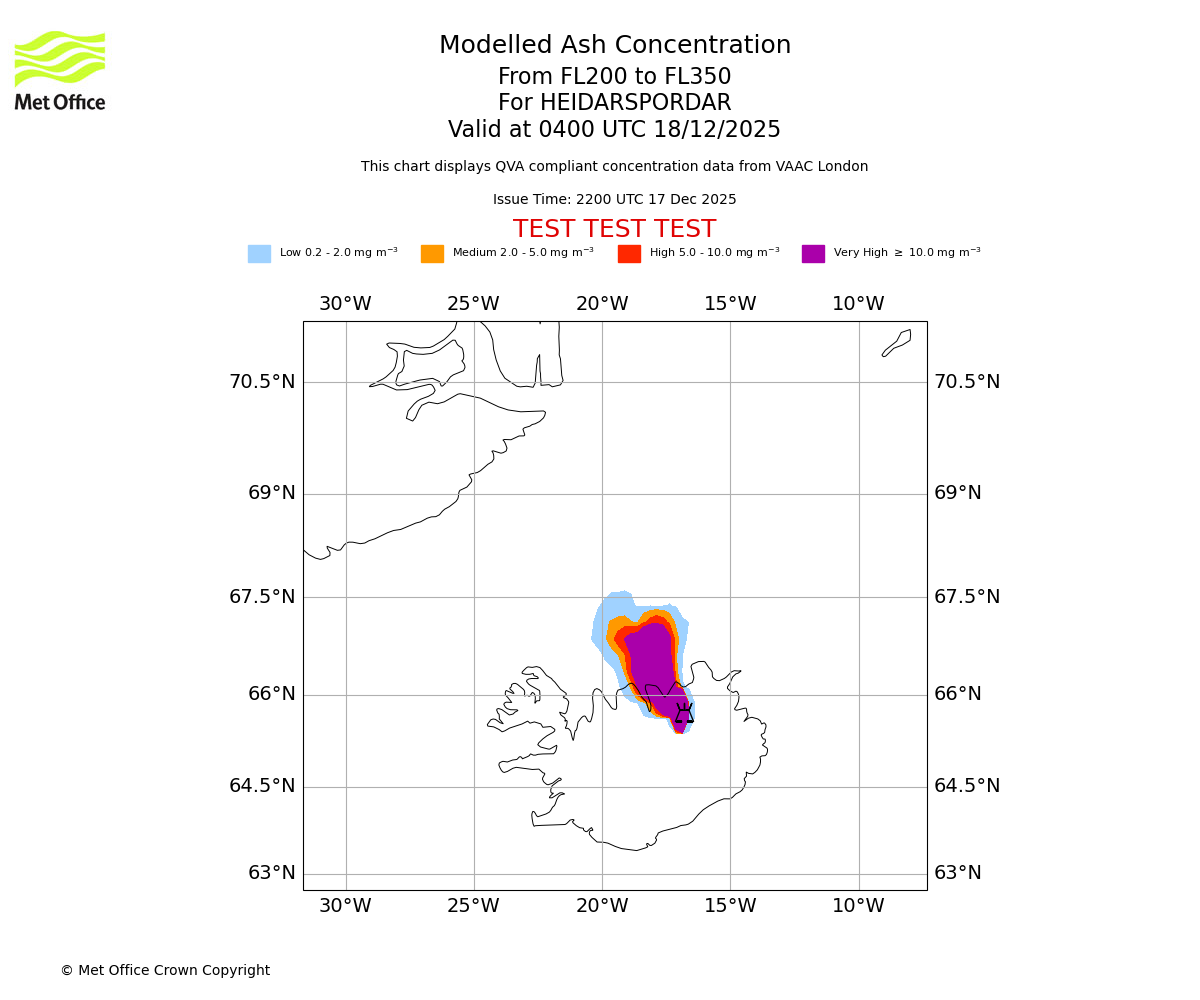 Modelled ash concentration from 200 to 350 for HEIDARSPORDAR. Valid at 2200 UTC 17/12/2025