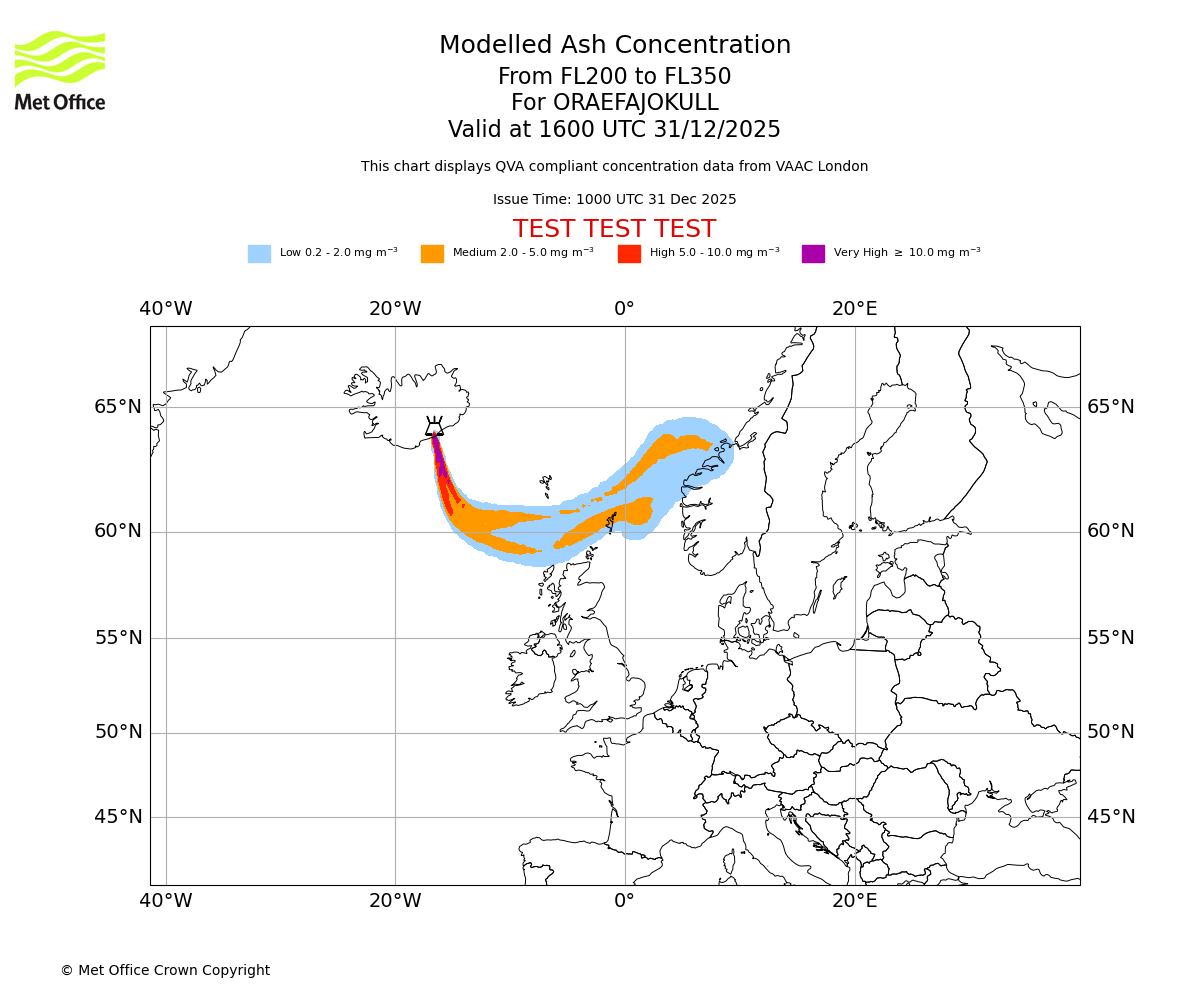 Modelled ash concentration from 200 to 350 for ORAEFAJOKULL. Valid at 1000 UTC 31/12/2025