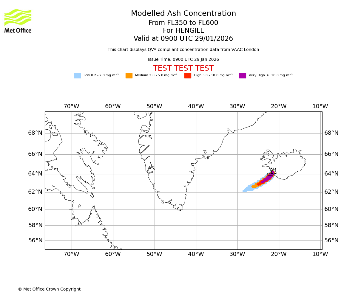Modelled ash concentration from 200 to 350 for HENGILL. Valid at 0900 UTC 29/01/2026