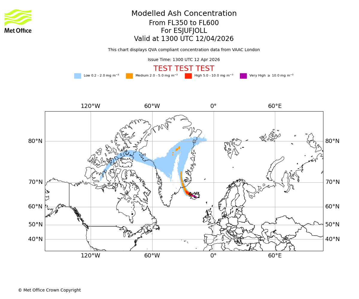 Modelled ash concentration from 200 to 350 for ESJUFJOLL. Valid at 1300 UTC 12/04/2026