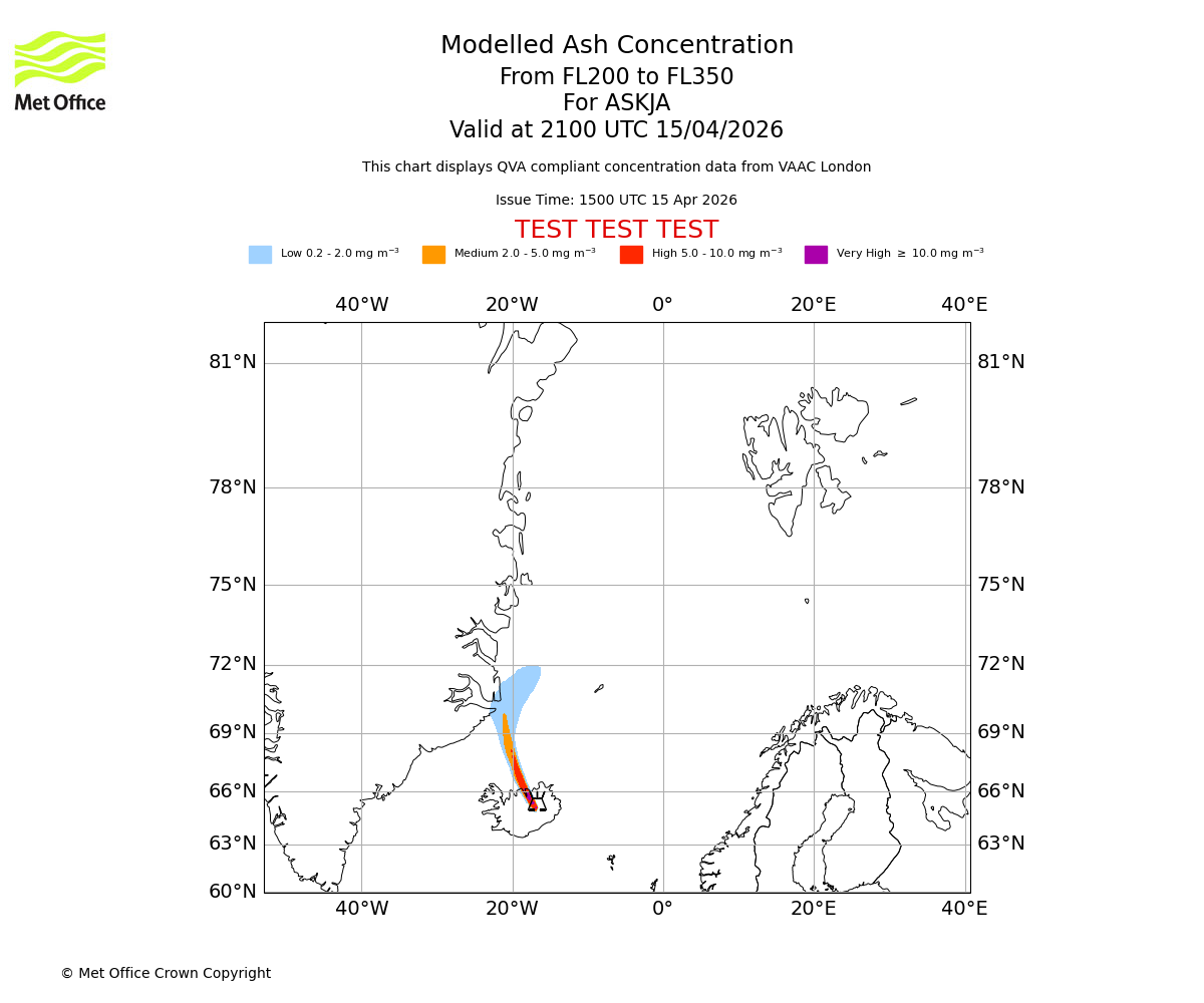 Modelled ash concentration from 200 to 350 for ASKJA. Valid at 1500 UTC 15/04/2026
