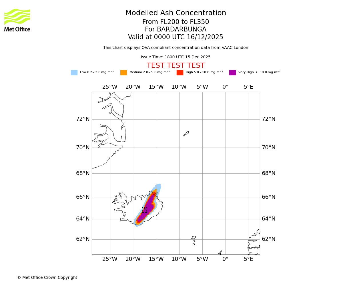 Modelled ash concentration from 200 to 350 for BARDARBUNGA. Valid at 1800 UTC 15/12/2025