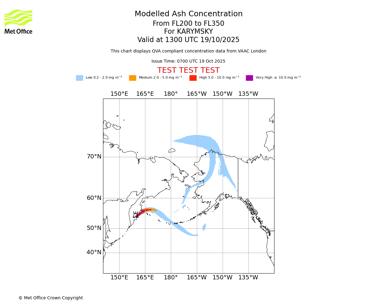 Modelled ash concentration from 200 to 350 for KARYMSKY. Valid at 0700 UTC 19/10/2025