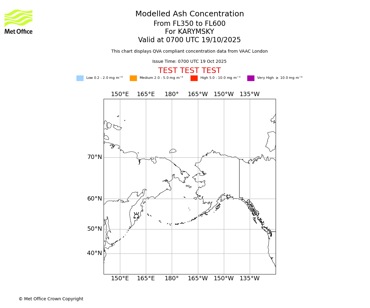 Modelled ash concentration from 000 to 050 for KARYMSKY. Valid at 0700 UTC 19/10/2025