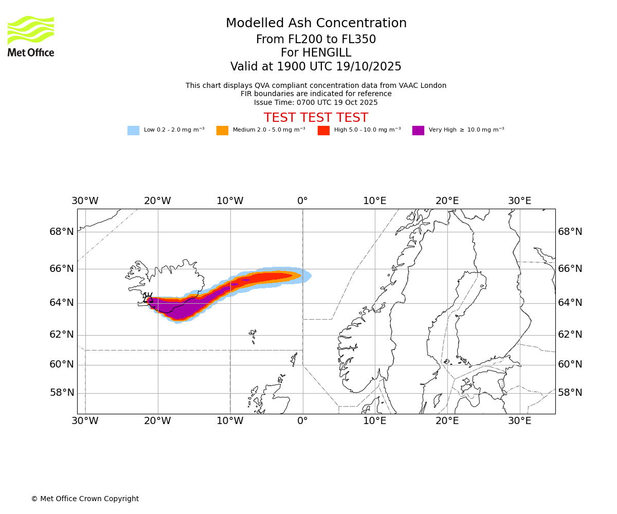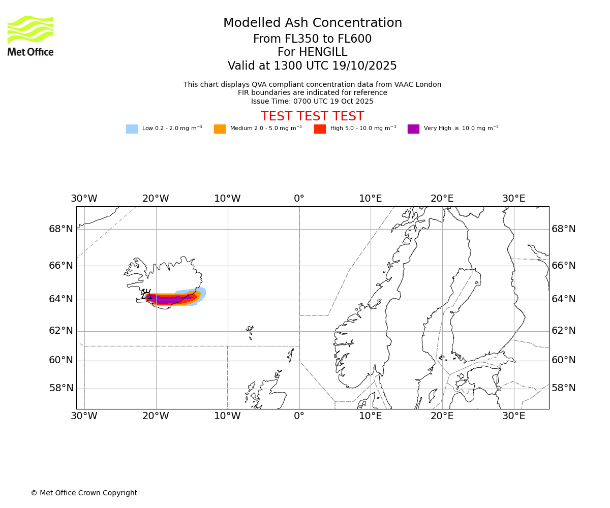 Modelled ash concentration from 200 to 350 for HENGILL. Valid at 1300 UTC 19/10/2025