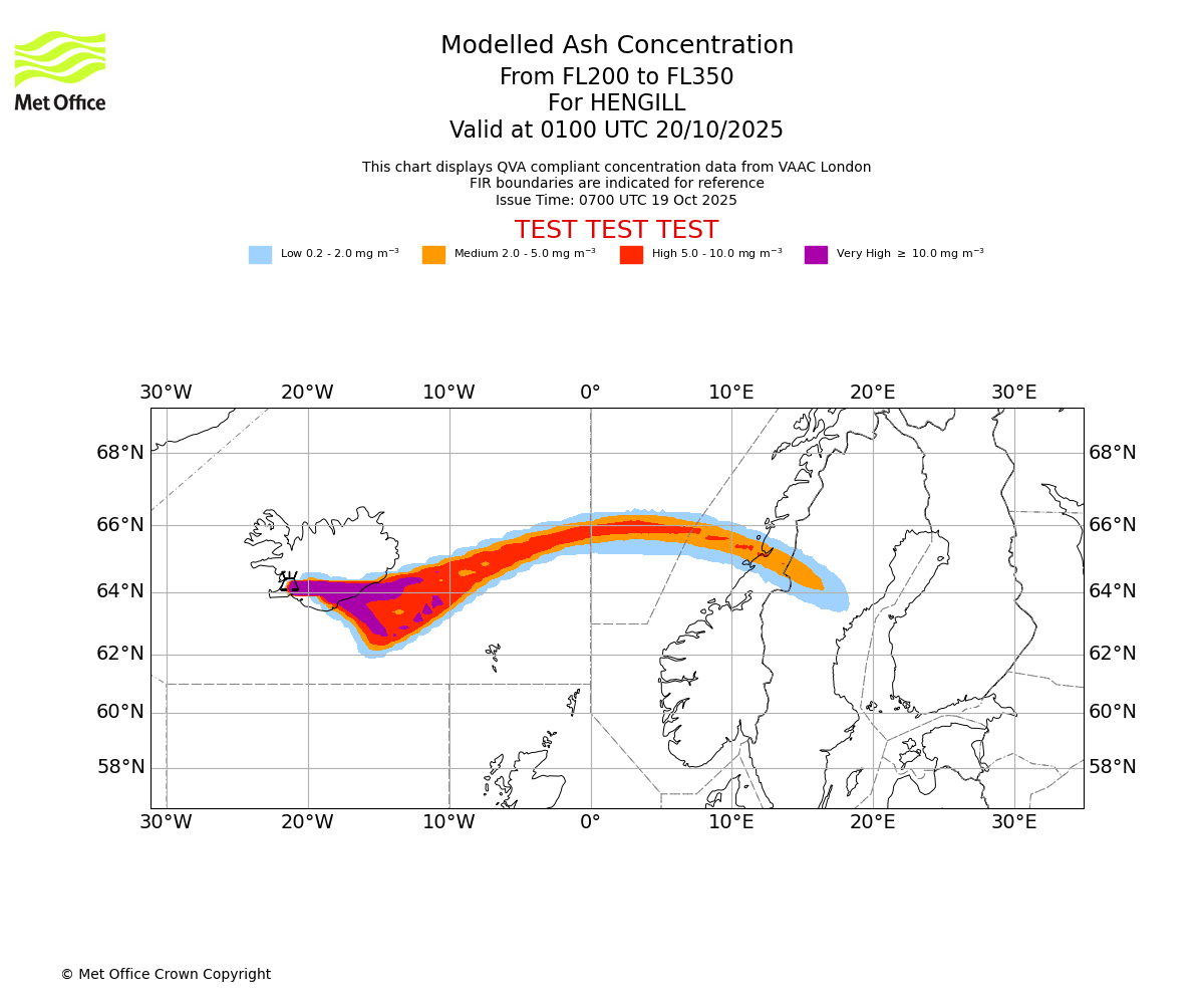 Modelled ash concentration from 200 to 350 for HENGILL. Valid at 1900 UTC 19/10/2025