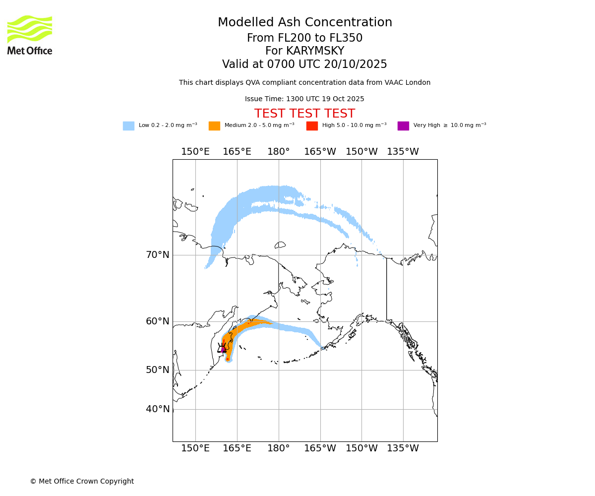 Modelled ash concentration from 200 to 350 for KARYMSKY. Valid at 0100 UTC 20/10/2025