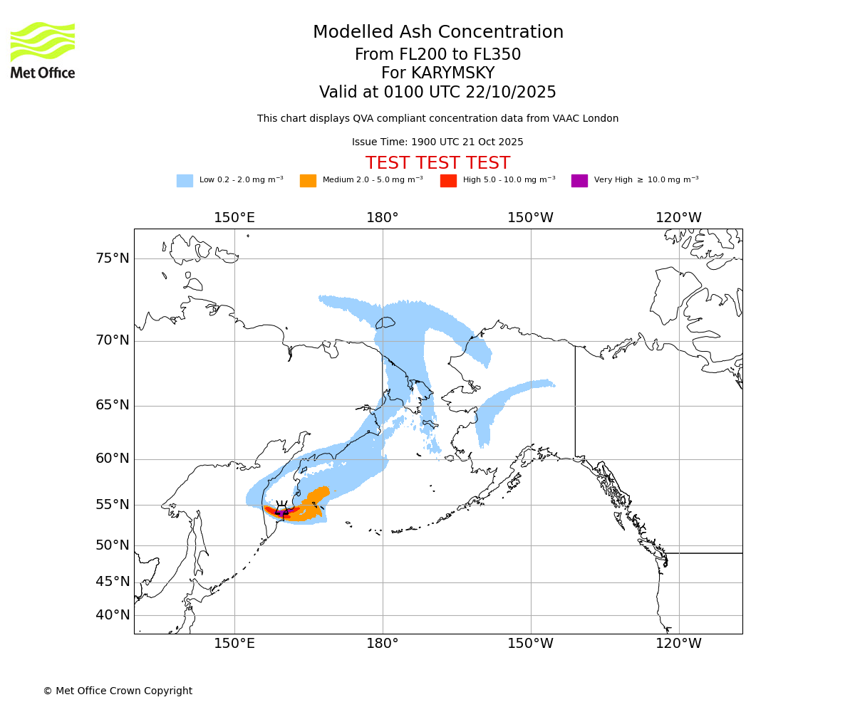 Modelled ash concentration from 200 to 350 for KARYMSKY. Valid at 1900 UTC 21/10/2025