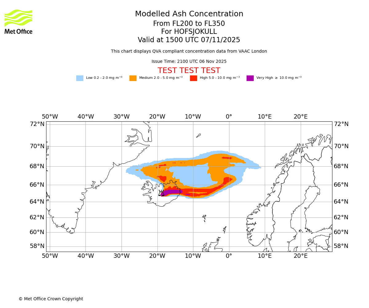In accordance with ICAO Annex 3, Amendment 82 VAAC London will provide operational QVA forecasts from 27 November 2025 and these will be made available via a VAAC London QVA API information service. These charts are currently provided for test and evaluation purposes (not for operational use) until the introduction of the operational service.