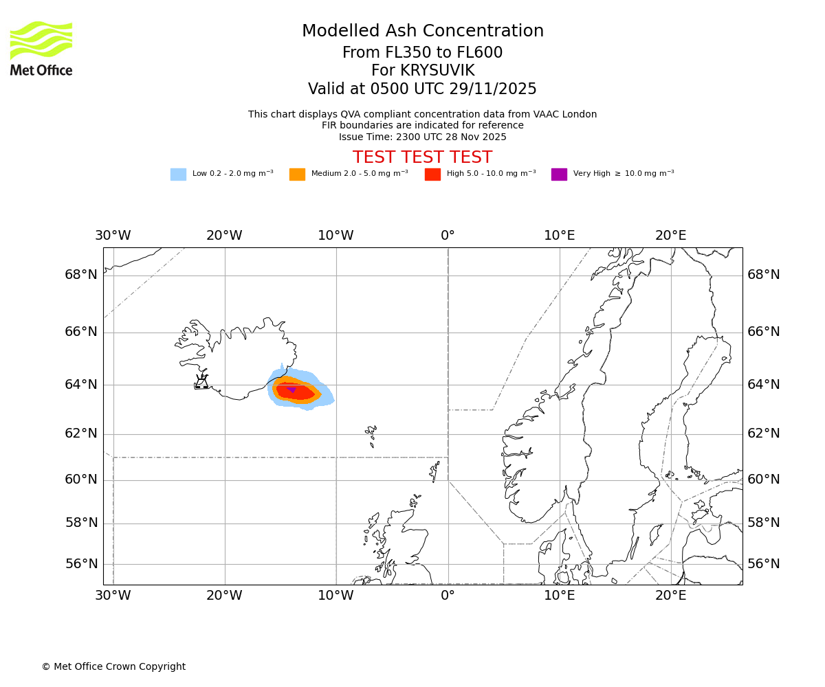 Modelled ash concentration from 200 to 350 for KRYSUVIK. Valid at 0500 UTC 29/11/2025