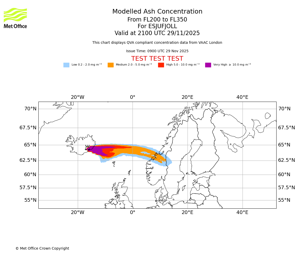 Modelled ash concentration from 000 to 050 for ESJUFJOLL. Valid at 0900 UTC 29/11/2025