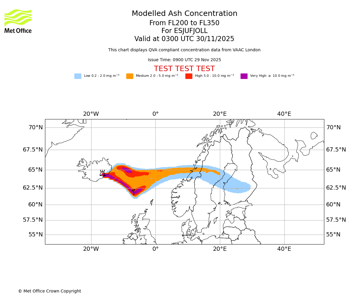 Modelled ash concentration from 200 to 350 for ESJUFJOLL. Valid at 2100 UTC 29/11/2025