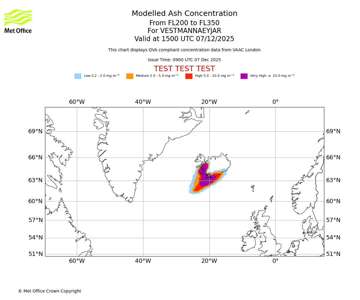 Modelled ash concentration from 200 to 350 for VESTMANNAEYJAR. Valid at 0900 UTC 07/12/2025