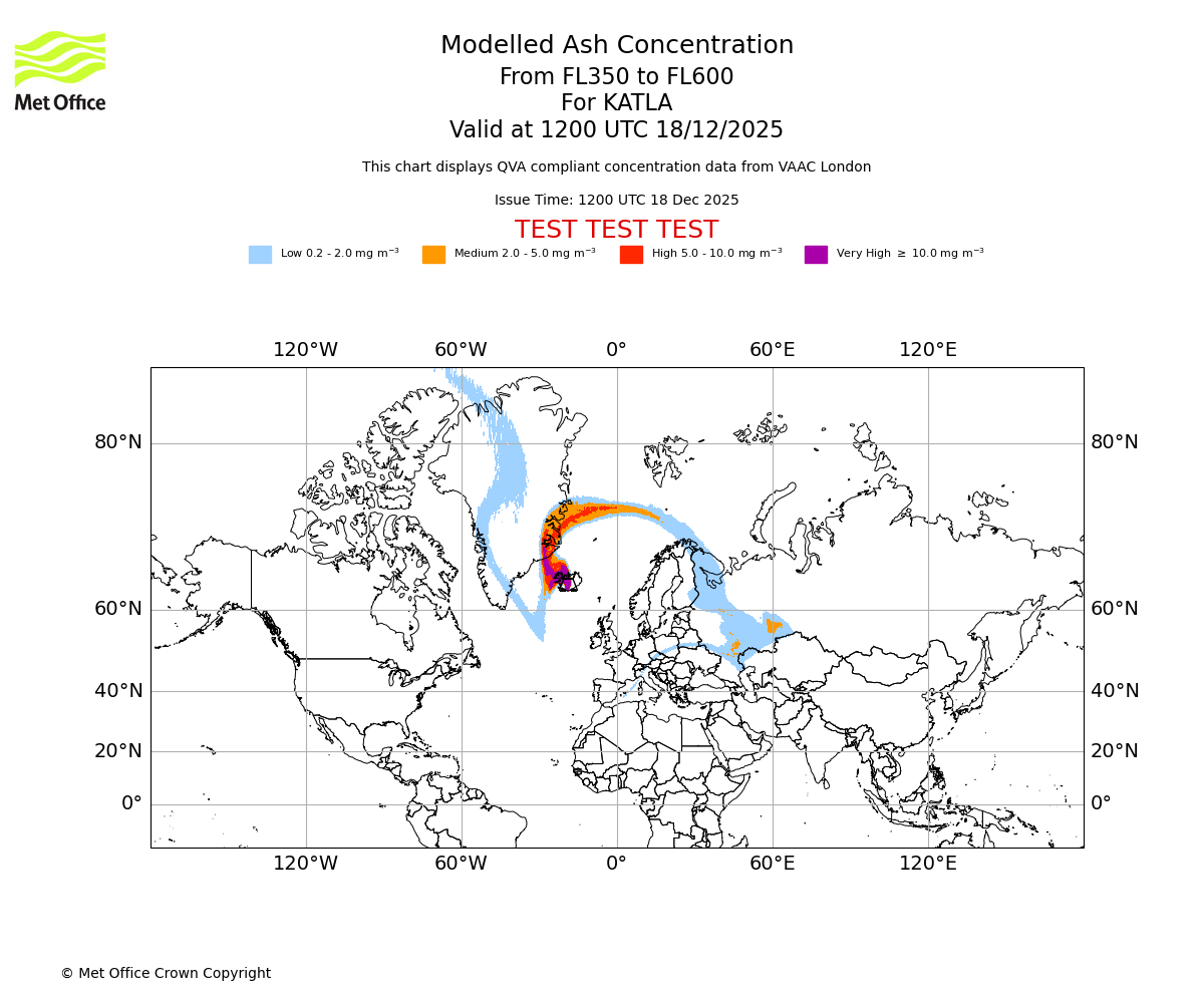 Modelled ash concentration from 000 to 050 for KATLA. Valid at 1200 UTC 18/12/2025