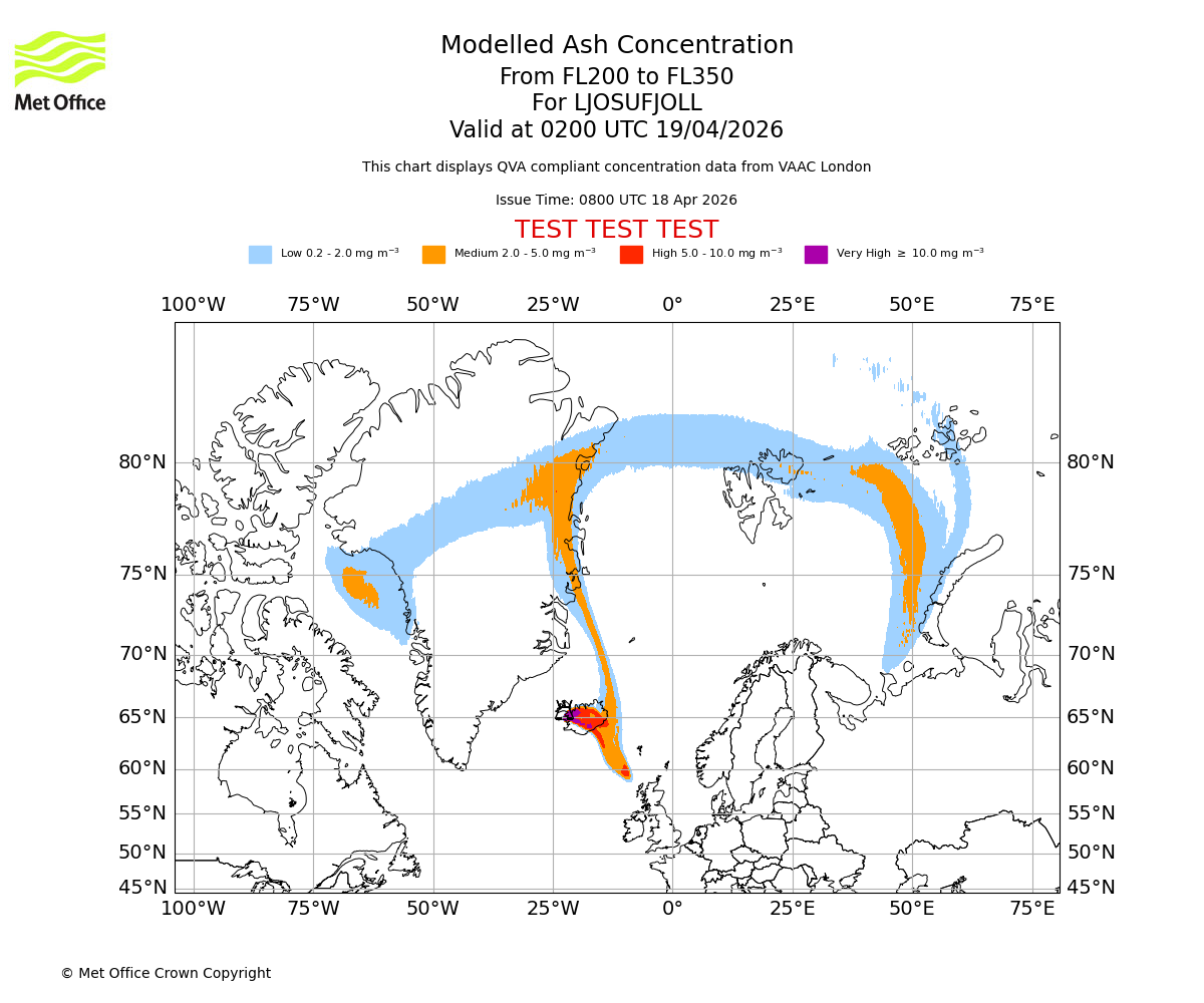 Modelled ash concentration from 200 to 350 for LJOSUFJOLL. Valid at 2000 UTC 18/04/2026