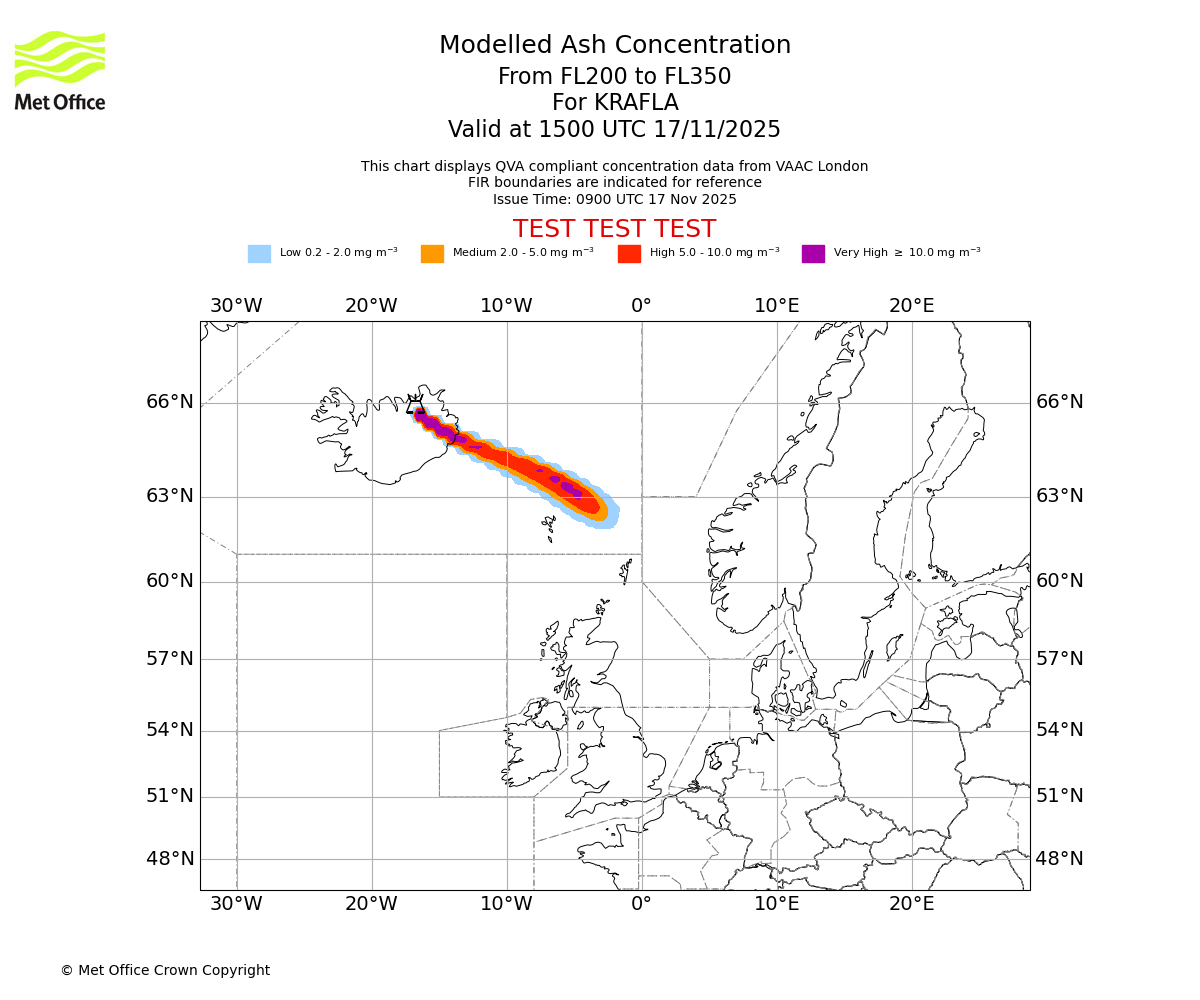 Modelled ash concentration from 200 to 350 for KRAFLA. Valid at 0900 UTC 17/11/2025