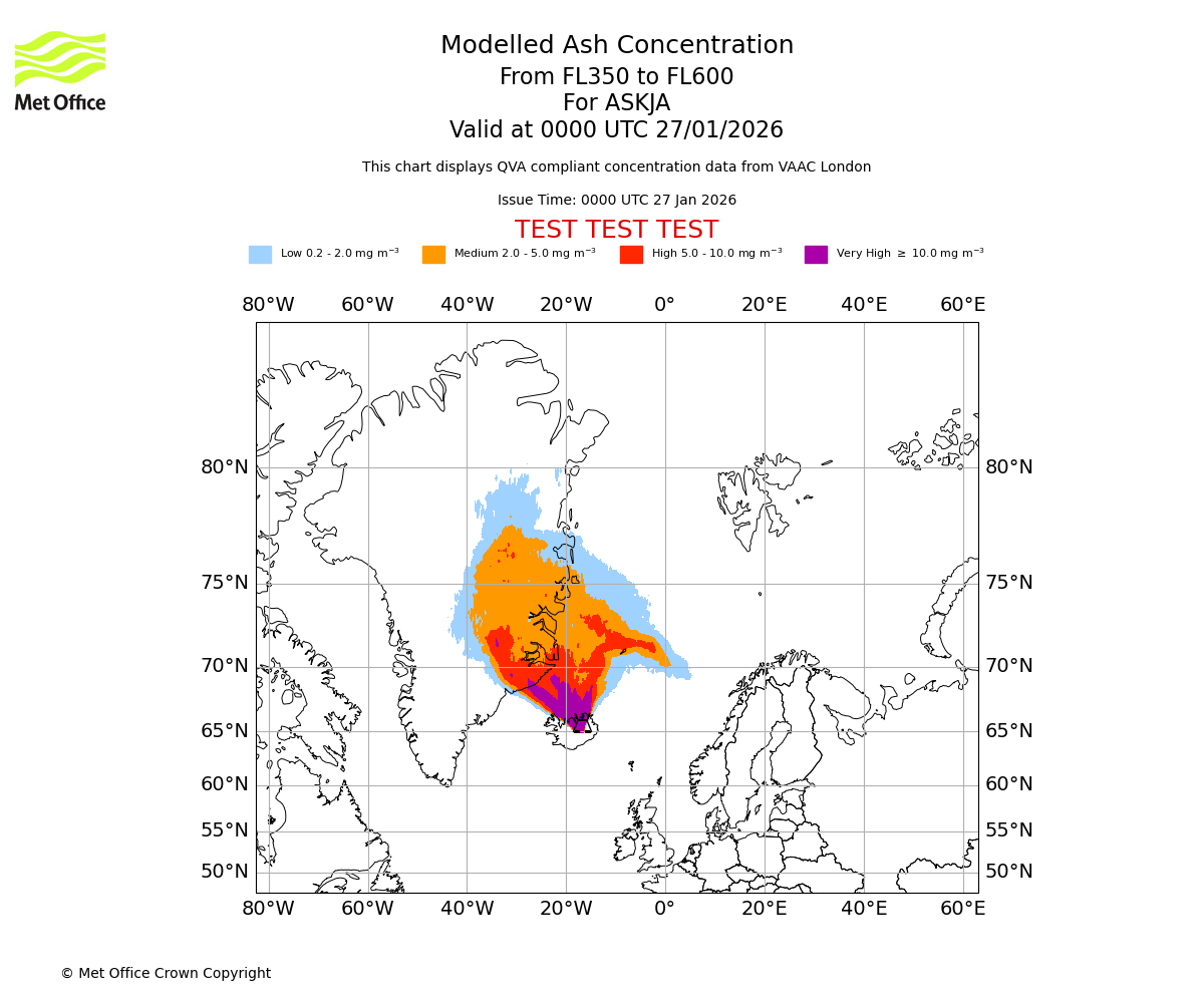 Modelled ash concentration from 000 to 050 for ASKJA. Valid at 0000 UTC 27/01/2026
