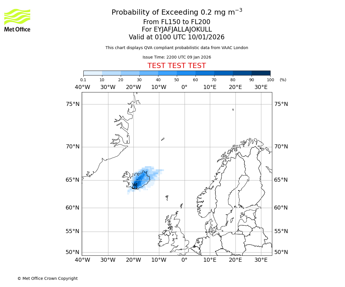 Probability of exceeding 0.2 milligrams per metre cubed. From 150 to 200 for EYJAFJALLAJOKULL. Valid at 2200 UTC 09/01/2026