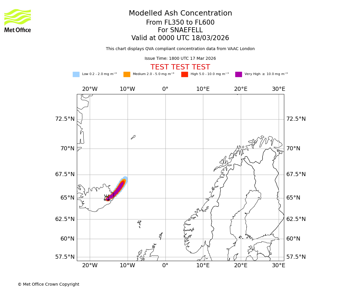 Modelled ash concentration from 350 to 600 for SNAEFELL. Valid at 1800 UTC 17/03/2026