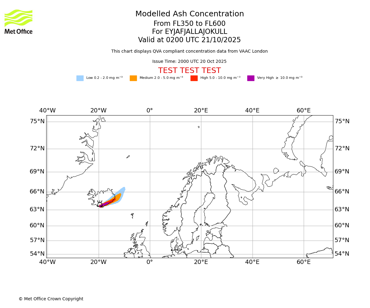 Modelled ash concentration from 350 to 600 for EYJAFJALLAJOKULL. Valid at 2000 UTC 20/10/2025