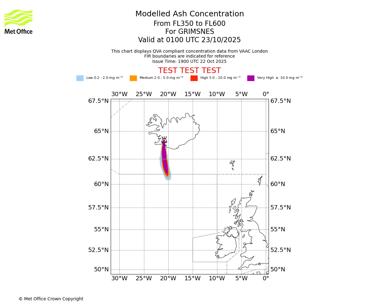 Modelled ash concentration from 350 to 600 for GRIMSNES. Valid at 1900 UTC 22/10/2025