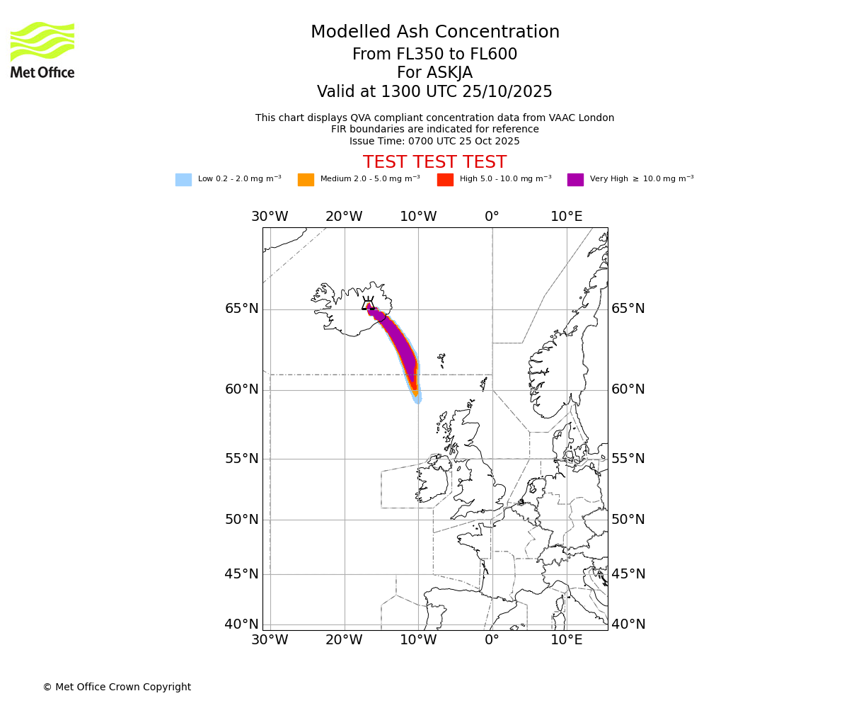 Modelled ash concentration from 350 to 600 for ASKJA. Valid at 0700 UTC 25/10/2025