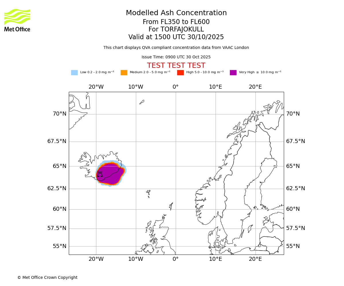 Modelled ash concentration from 350 to 600 for TORFAJOKULL. Valid at 0900 UTC 30/10/2025