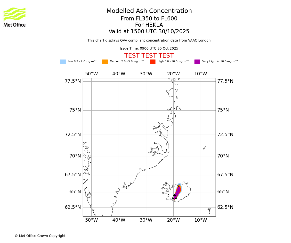 Modelled ash concentration from 350 to 600 for HEKLA. Valid at 0900 UTC 30/10/2025