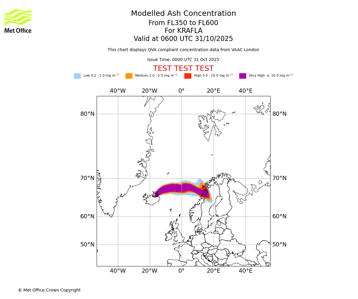 Modelled ash concentration from 350 to 600 for KRAFLA. Valid at 0000 UTC 31/10/2025
