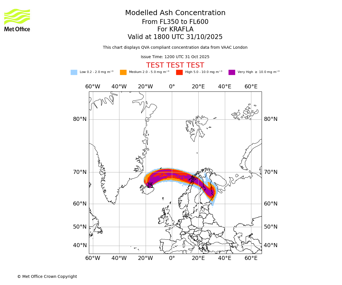 Modelled ash concentration from 350 to 600 for KRAFLA. Valid at 1200 UTC 31/10/2025