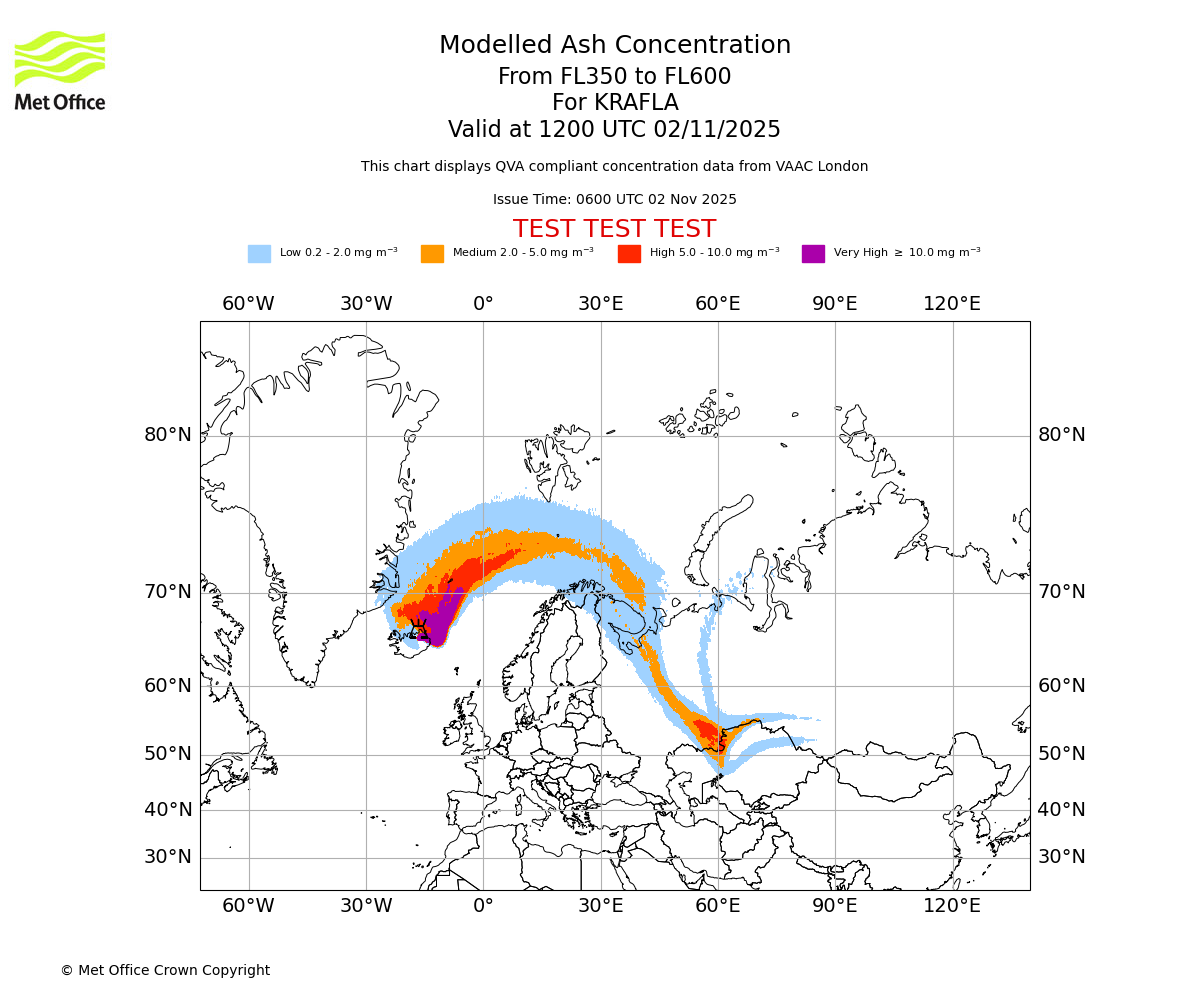 In accordance with ICAO Annex 3, Amendment 82 VAAC London will provide operational QVA forecasts from 27 November 2025 and these will be made available via a VAAC London QVA API information service. These charts are currently provided for test and evaluation purposes (not for operational use) until the introduction of the operational service.