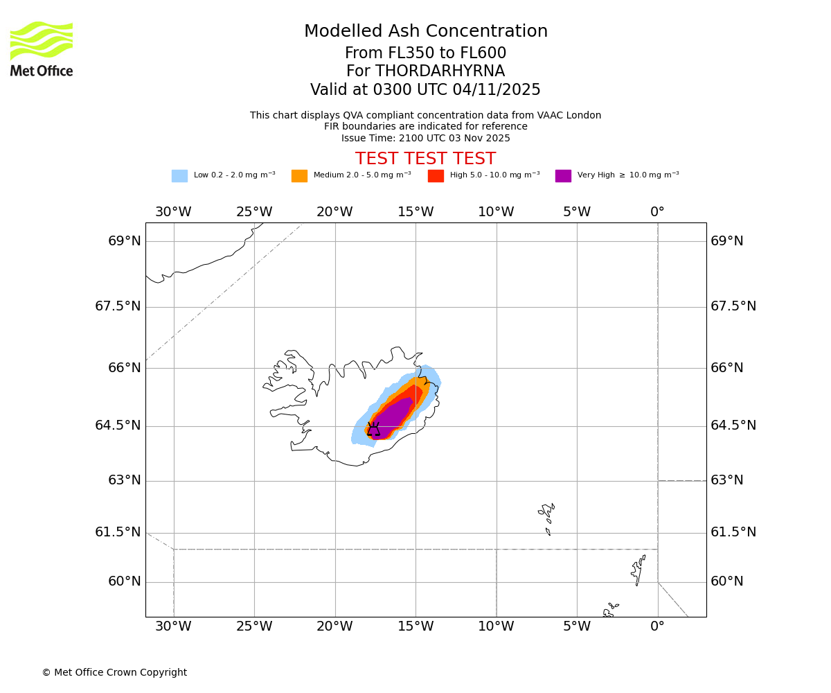 Modelled ash concentration from 350 to 600 for THORDARHYRNA. Valid at 2100 UTC 03/11/2025