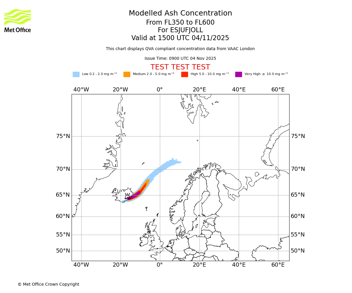 Modelled ash concentration from 350 to 600 for ESJUFJOLL. Valid at 0900 UTC 04/11/2025