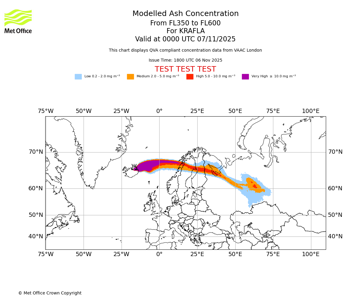 In accordance with ICAO Annex 3, Amendment 82 VAAC London will provide operational QVA forecasts from 27 November 2025 and these will be made available via a VAAC London QVA API information service. These charts are currently provided for test and evaluation purposes (not for operational use) until the introduction of the operational service.