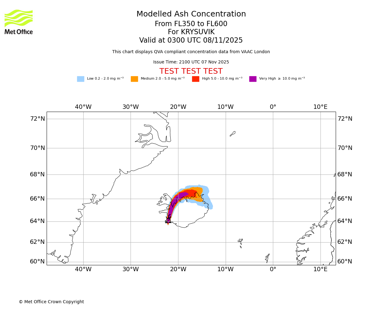 Modelled ash concentration from 350 to 600 for KRYSUVIK. Valid at 2100 UTC 07/11/2025