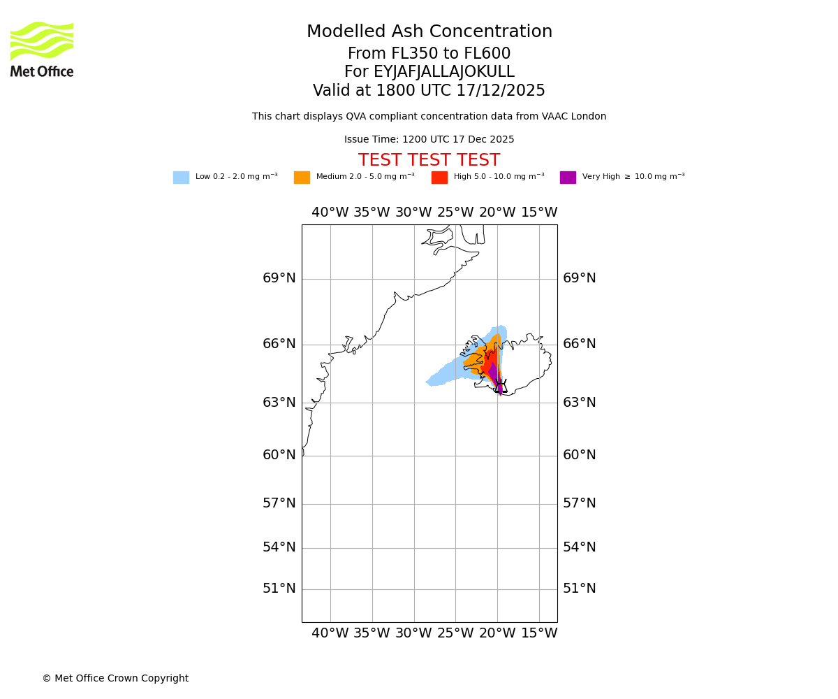 Modelled ash concentration from 350 to 600 for EYJAFJALLAJOKULL. Valid at 1200 UTC 17/12/2025