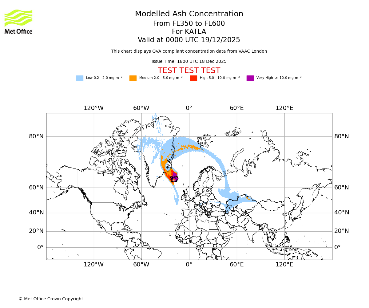 Modelled ash concentration from 350 to 600 for KATLA. Valid at 1800 UTC 18/12/2025