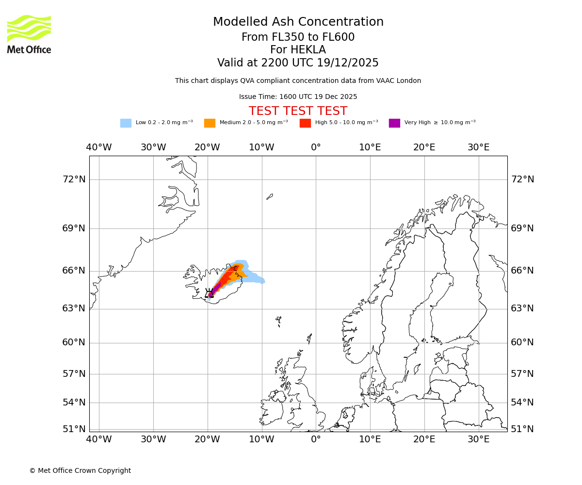 Modelled ash concentration from 350 to 600 for HEKLA. Valid at 1600 UTC 19/12/2025