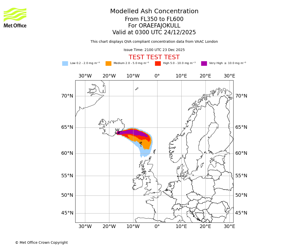 Modelled ash concentration from 350 to 600 for ORAEFAJOKULL. Valid at 2100 UTC 23/12/2025
