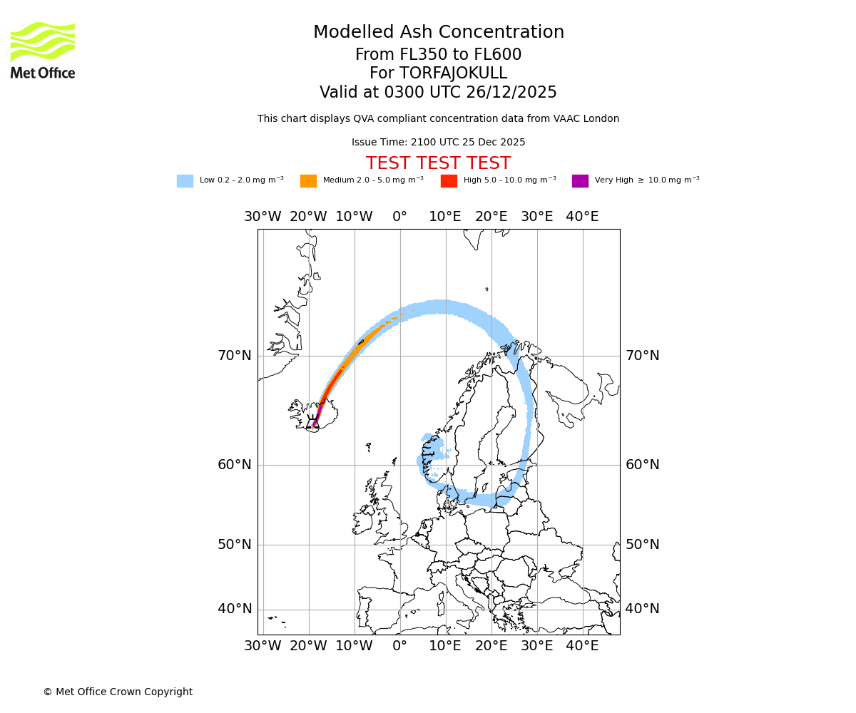 Modelled ash concentration from 350 to 600 for TORFAJOKULL. Valid at 2100 UTC 25/12/2025