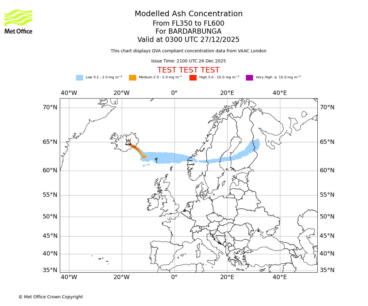 Modelled ash concentration from 350 to 600 for BARDARBUNGA. Valid at 2100 UTC 26/12/2025
