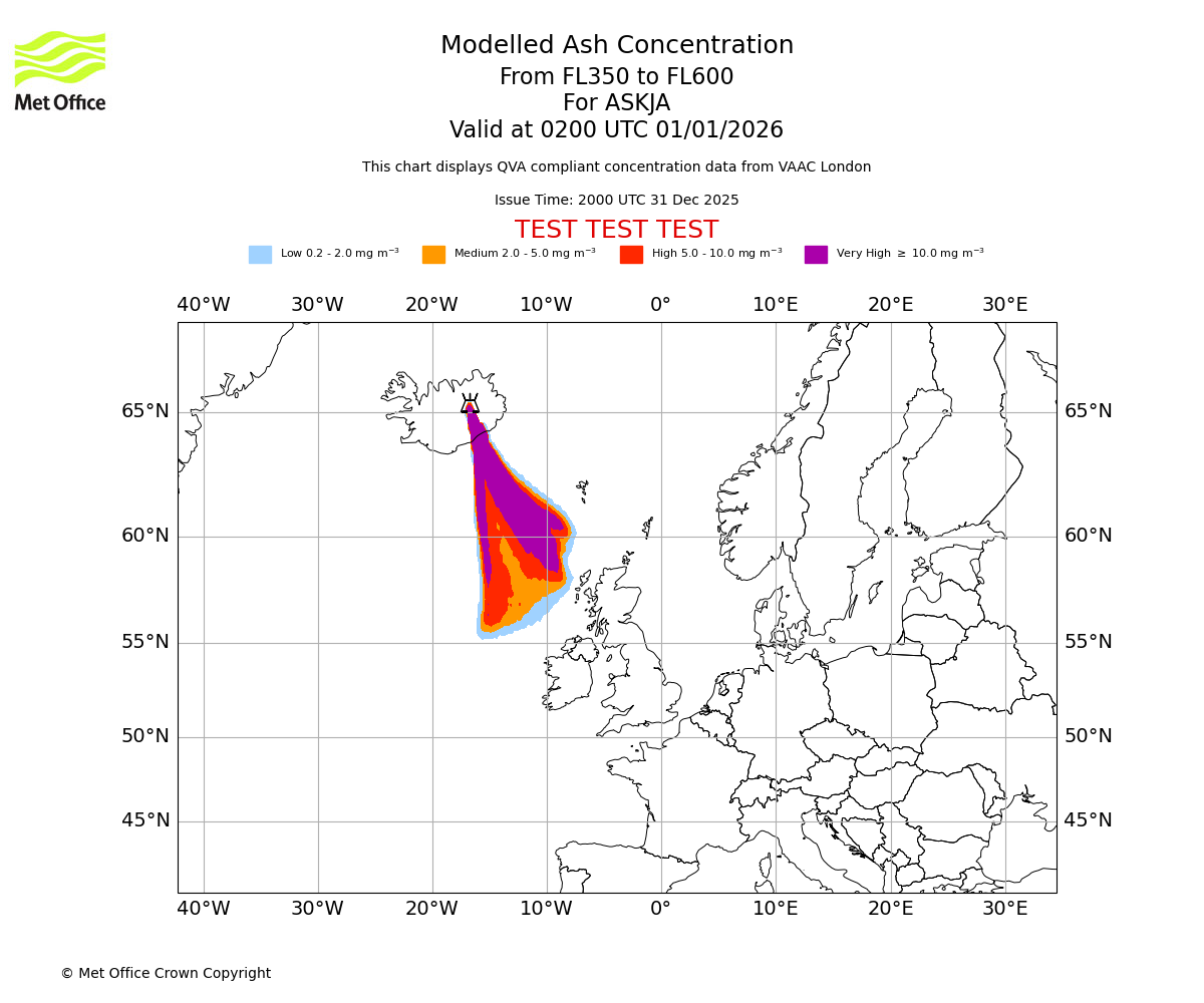 Modelled ash concentration from 350 to 600 for ASKJA. Valid at 2000 UTC 31/12/2025