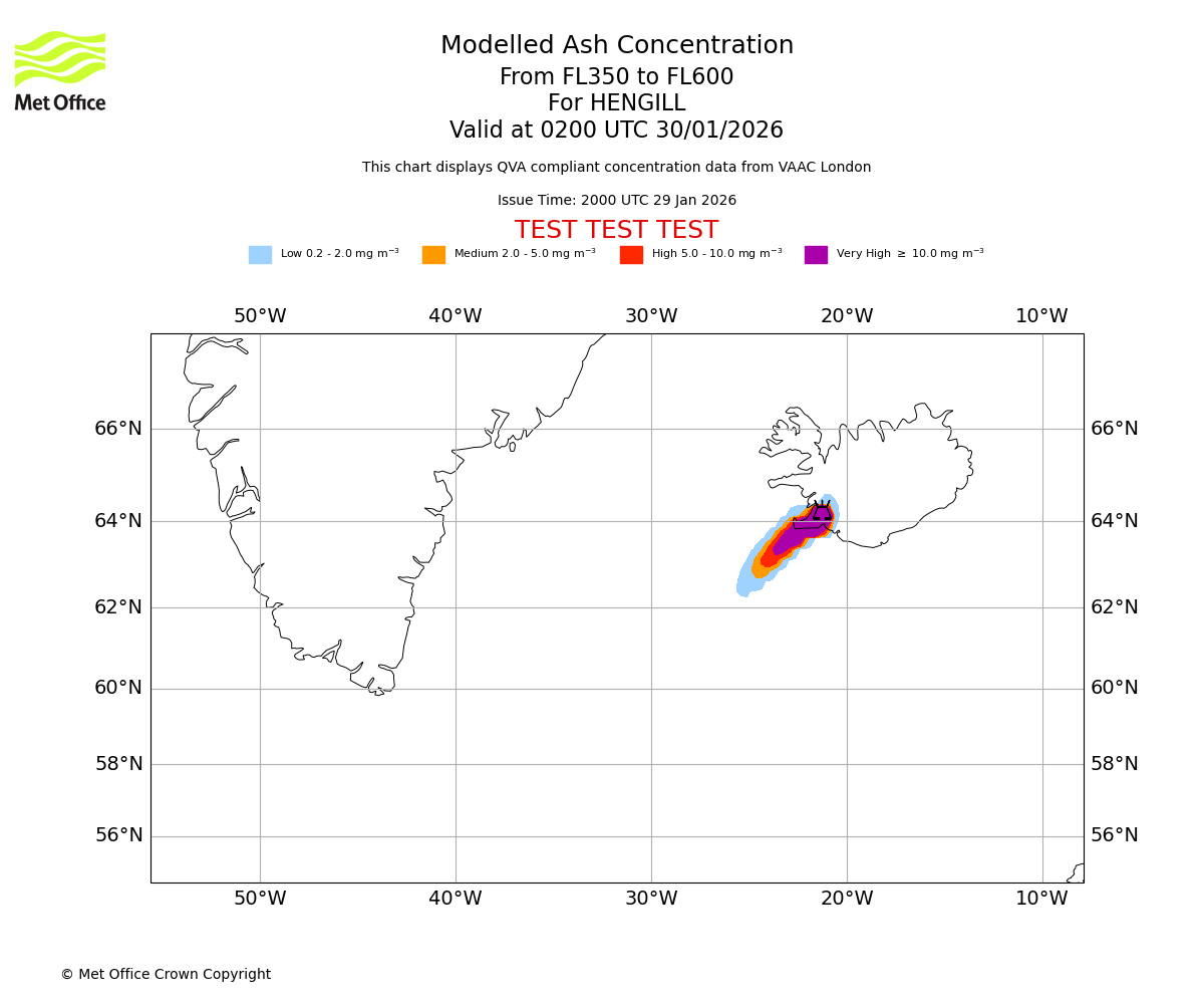 Modelled ash concentration from 350 to 600 for HENGILL. Valid at 2000 UTC 29/01/2026