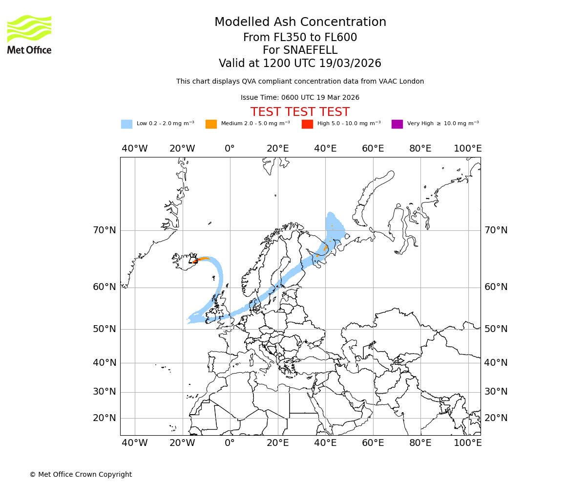 Modelled ash concentration from 350 to 600 for SNAEFELL. Valid at 0600 UTC 19/03/2026