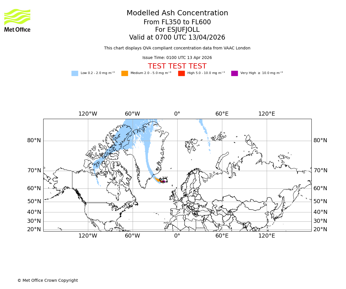 Modelled ash concentration from 350 to 600 for ESJUFJOLL. Valid at 0100 UTC 13/04/2026