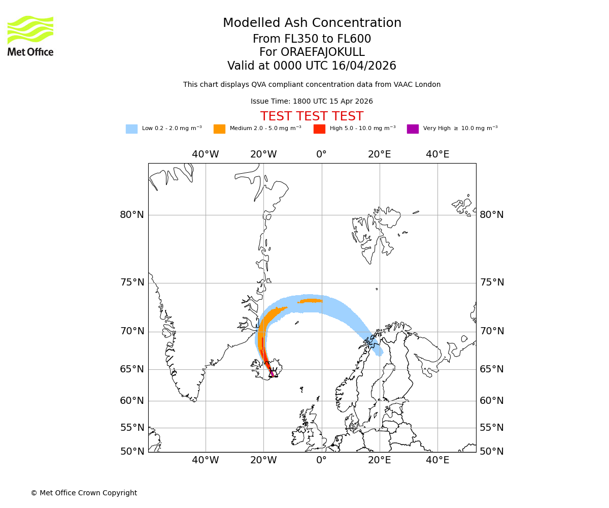 Modelled ash concentration from 350 to 600 for ORAEFAJOKULL. Valid at 1800 UTC 15/04/2026