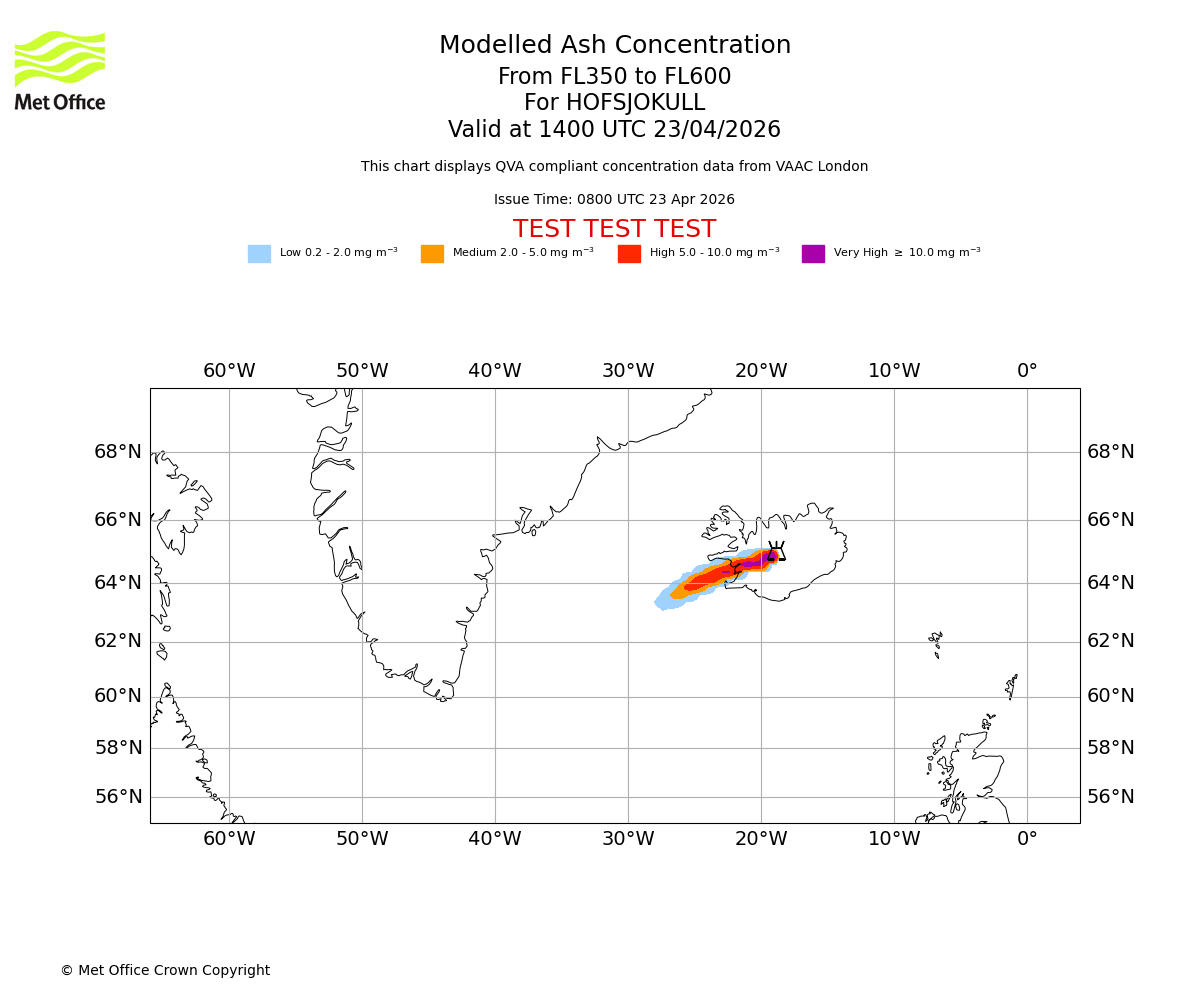Modelled ash concentration from 350 to 600 for HOFSJOKULL. Valid at 0800 UTC 23/04/2026