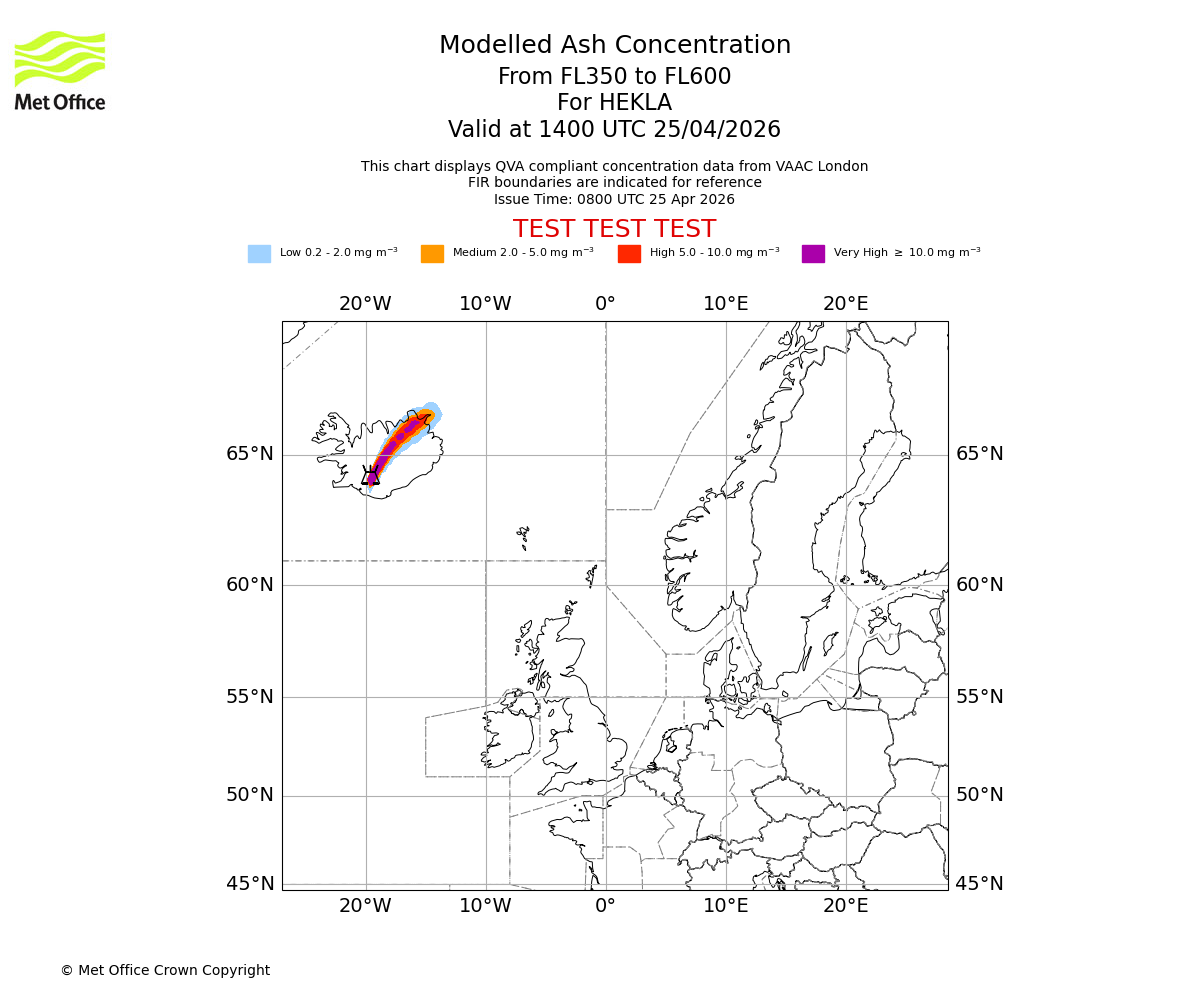 Modelled ash concentration from 350 to 600 for HEKLA. Valid at 0800 UTC 25/04/2026