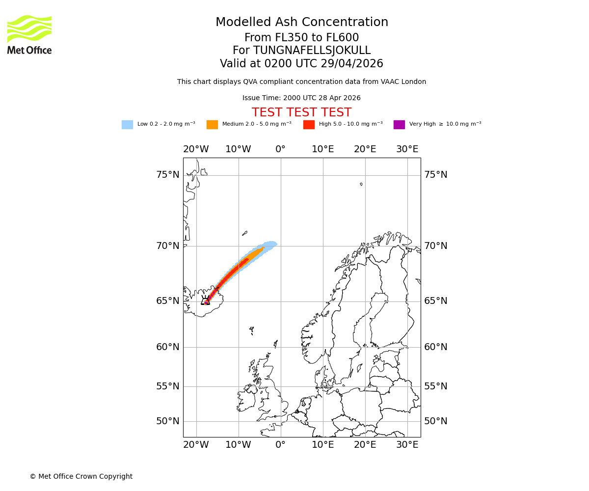 Modelled ash concentration from 350 to 600 for TUNGNAFELLSJOKULL. Valid at 2000 UTC 28/04/2026
