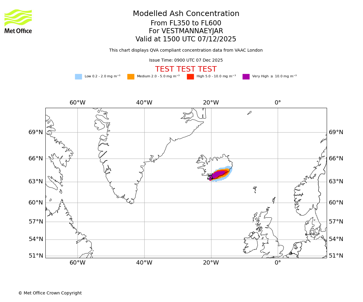 Modelled ash concentration from 350 to 600 for VESTMANNAEYJAR. Valid at 0900 UTC 07/12/2025